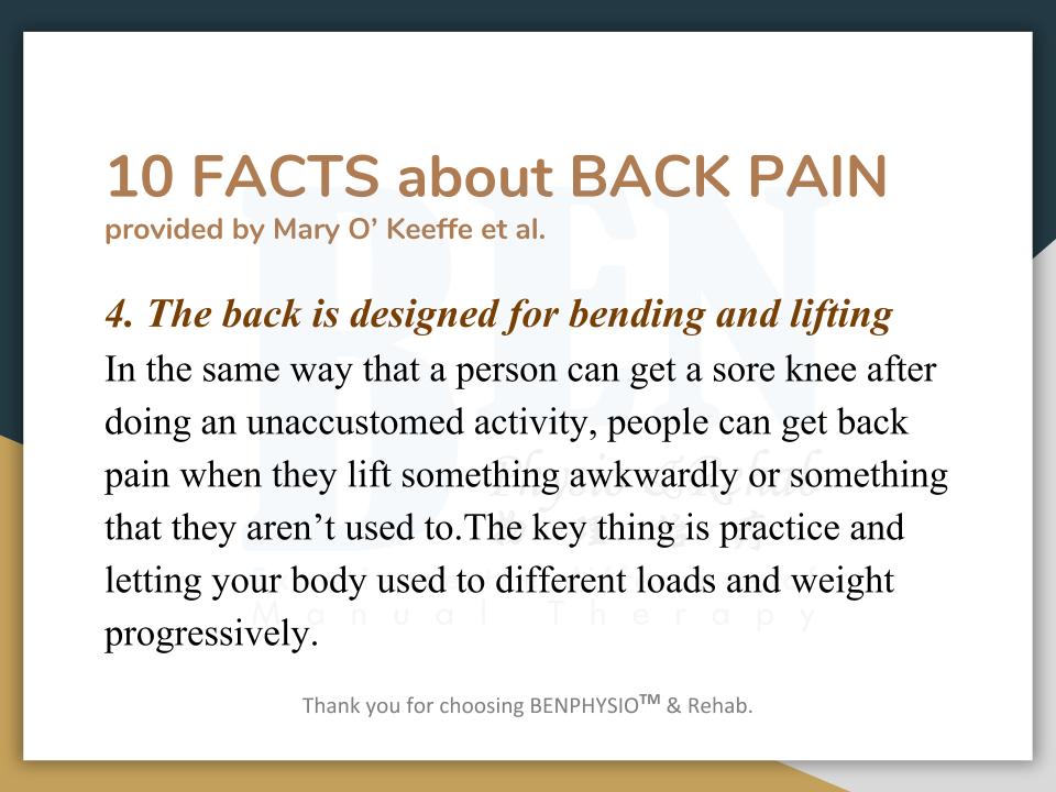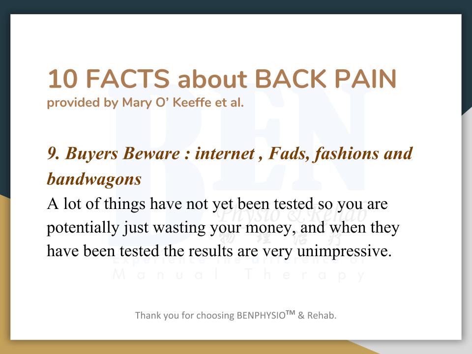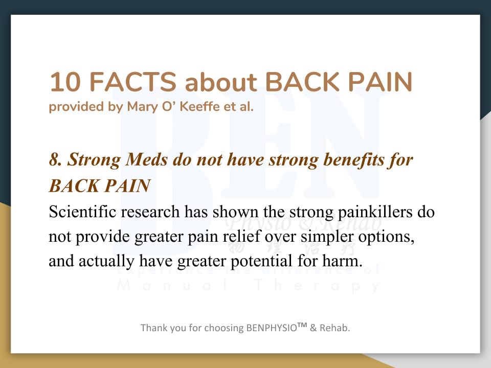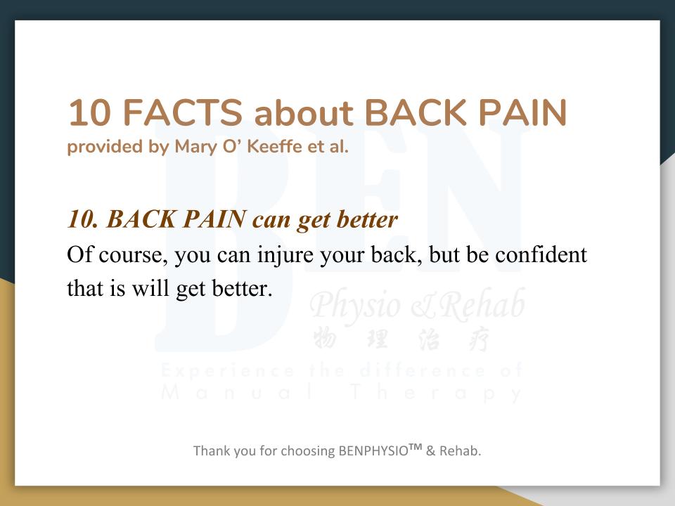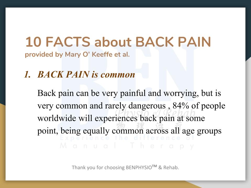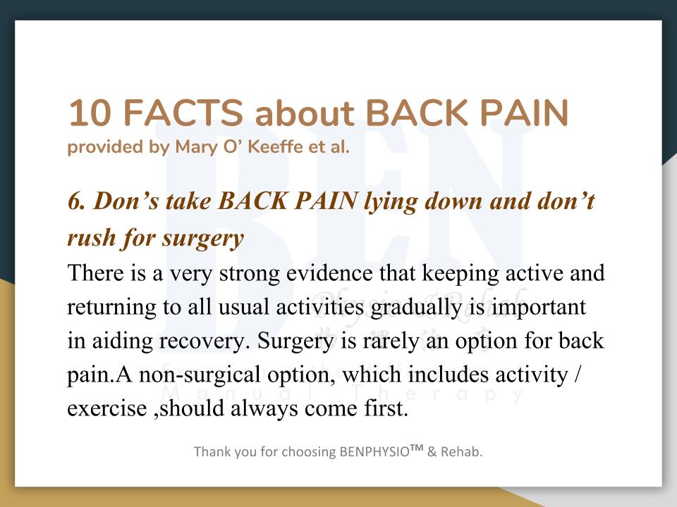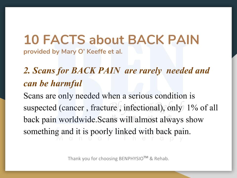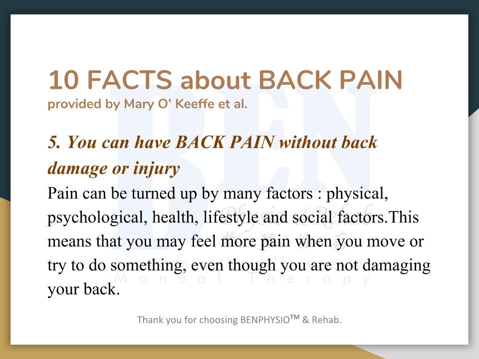 Often associated with “slipped disc”, “bone spur”, ''spondylosis'', ''hamstring strain'', ''piriformis syndrome'', etc. In Ben Physio, we do not look at 'slipped disc', 'spondylosis', 'bone spur' as your problem(s).
