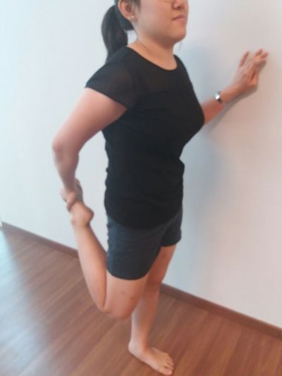 Position like the picture, pull your ankle towards your buttock. You should feel gentle-nice pulling over the front thigh.